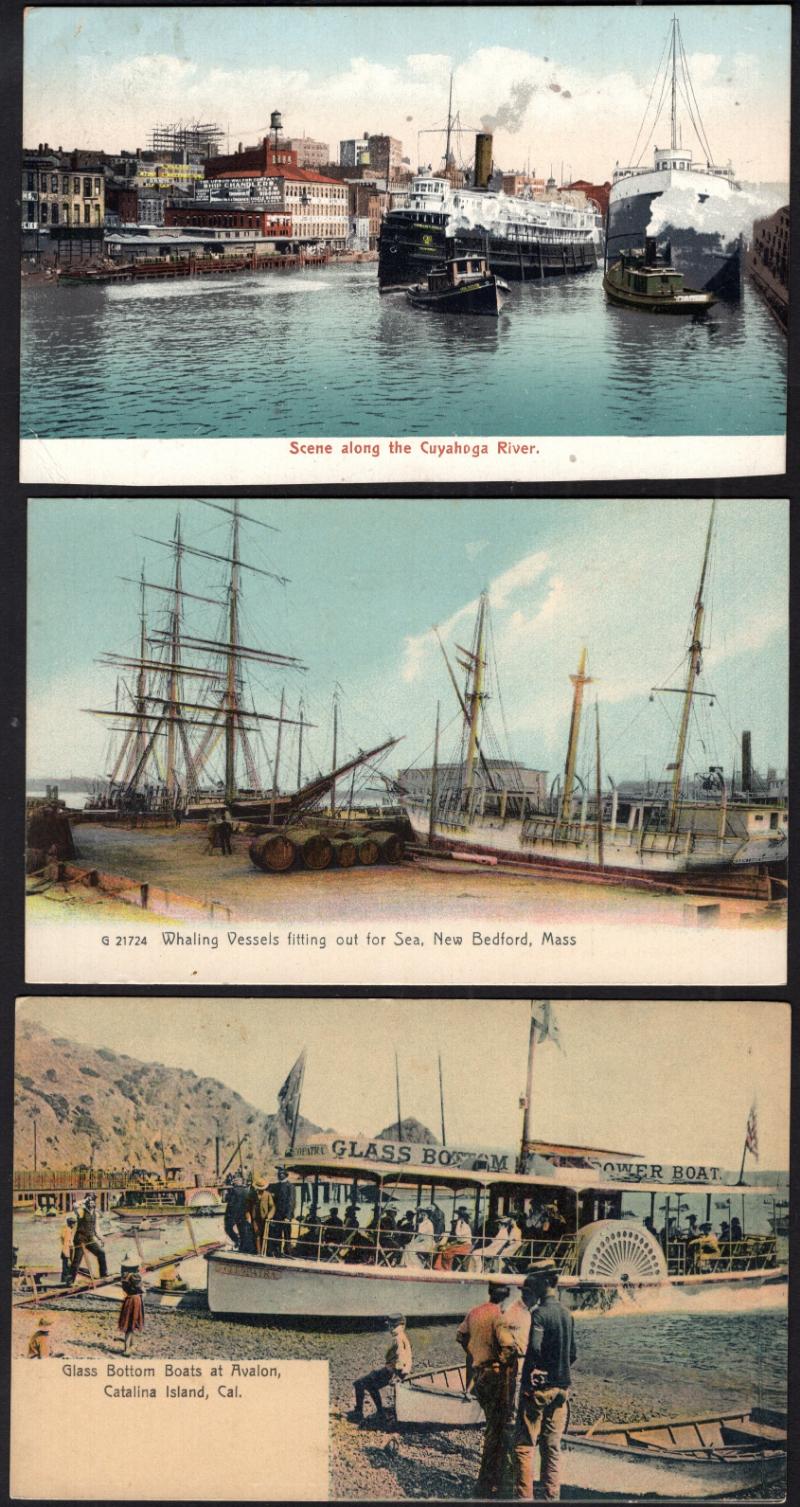 Abt (2150) Vintage PPC stored in (3) old shoeboxes, boats & ships of all kinds; at sea, in port, unloading at dock, dry dock, on lake & river, urban & rural, ice boat, ferry, glass-bottom tourist, military battleships incl a submarine, being built, boats as part of the scenery, sailors, steamers & more; vintage, undivided back, RPC, fancy, some foreign; noted Alaska, Maine & other New England, Groton, Philadelphia Naval Yard, California, Germany, GB; quality accum by long-time collector, many are mailed, some expected light wear or corner crease, gen F-VF (Image)