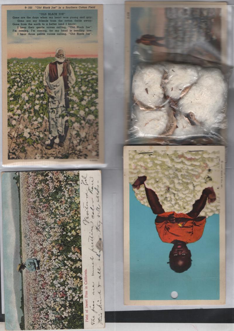 BLACK AMERICANA Binder w/ abt (100) PPC, vintage, white border & a few early chrome; many typical scenes although not as over the top as often seen; scenes of cotton fields, baling, other crops (sugar cane, turpentine, peanuts, strawberries), old folks at home, homes, some humor; a few mailed, a few RPC, couple photographs & a Valentine; gen F-VF (Image)