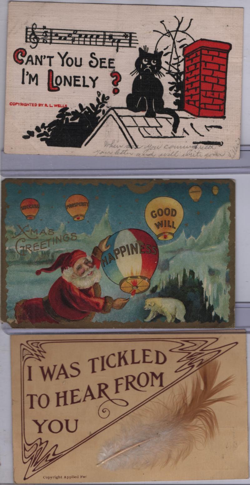 Assortment abt (500) better vintage to white border cards, each in hard plastic postcard sleeve, some undivided backs, most are mailed, some holidays (New Year, Christmas) but also humor, city views & other travel scenes; foreign mostly Germany (views & Christmas); pretty ladies (incl series w/ Gibson girl type w/ a frog); many fancy, good variety w/ no commons, gen F-VF (Image)