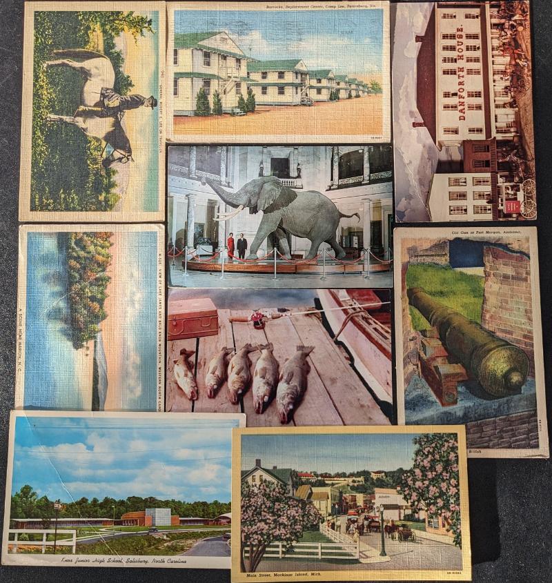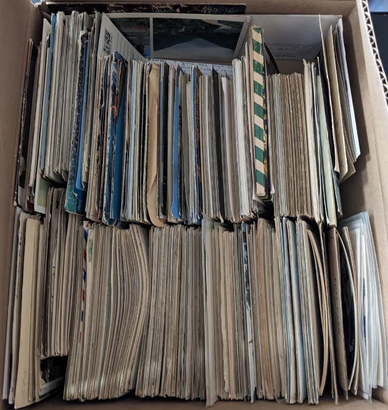 A large & medium carton jam packed w/ loose unsorted PPC of all kinds, well over (7500), peering in the boxes I noticed vintage to chrome (1980s), a few wooden, travel, natural wonders, motels, historic sites, automobile adv, humor, RPC, some sleeved, some in small groups by state (Vermont, New Jersey, likely others), a real accum over the years by retiring dealer, did not notice much foreign, some mailed, gen F-VF