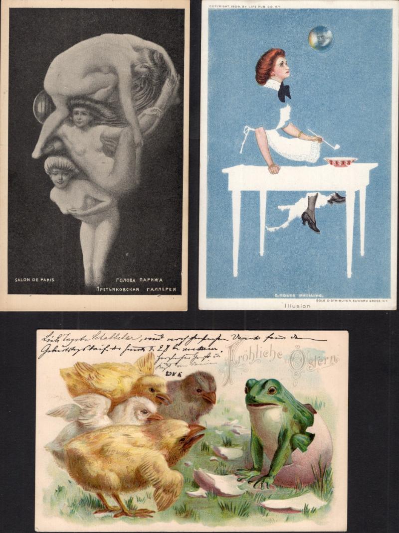 "The Language of Stamps" topical postcards 1900s-60s (41) PPC showing examples of how the placement of the stamp expresses meaning, such as write soon, I love you, forget me not, a kiss, I love someone else, etc., cards from Germany, France, Netherlands, Belgium, Switzerland, GB, Finland and Norway, some mailed; also (13) German PPC actual mailed examples w/ stamps in different positions, addressed to ladies; also (4) PPC w/ stamps removed showing text written under the stamp (also German); great accumulation, gen F-VF; ex-Stupell (Image)