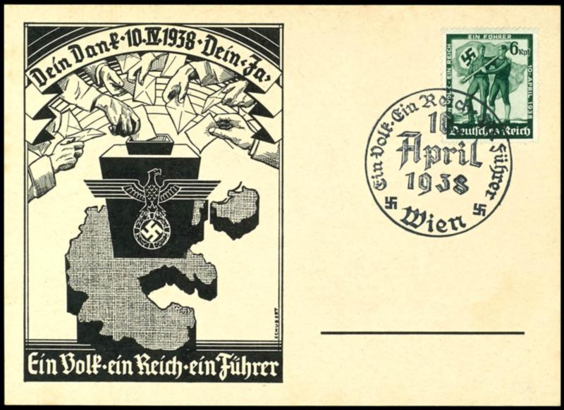 1938, \Your Thanks to, Your yes, 10.4.1938, a people, a Reich, a leader\. decorative Commemorative postcard to the Reichstag election franked with number 663 and appropriate special cancel 1938, \Dein Dank, dein Ja, 10.4.1938, ein Volk, ein Reich, ein Führer\. Dekorative Gedenkpostkarte zur Reichstagswahl frankiert mit Nr.663 und entsprechendem Sonderstempel (Image)