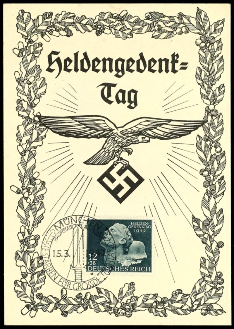 1942, commemorative page to the Memorial Day with Michel 812 and special cancel from 15.3.42, very fine (812) 1942, Gedenkblatt zum Heldengedenktag mit Mi. 812 und Sonderstempel vom 15.3.42, tadellose Erhaltung (Image)