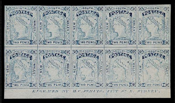 FORGERIES & FANTASIES: AUSTRALIA: New South Wales; 1852-55 Imprinted Block of 10, course printing on bluish paper no "gum" actually quite impressive. (SG 58 var. £10,800, 15 var $26,000 if genuine) Sale and Lot Updates Suggested Bid $300-400 (Image)