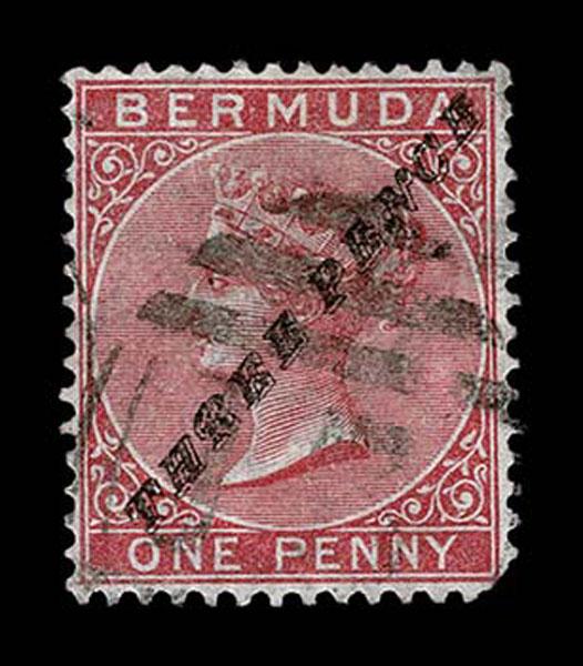 FORGERIES & FANTASIES: Bermuda; 1874 3 pence on 1p rose. probably genuine cancel, excellent crisp printing, cropped corner perforation, quite good. (SG 11 $20,000 if genuine) Sale and Lot Updates Suggested Bid $100-150 (Image)