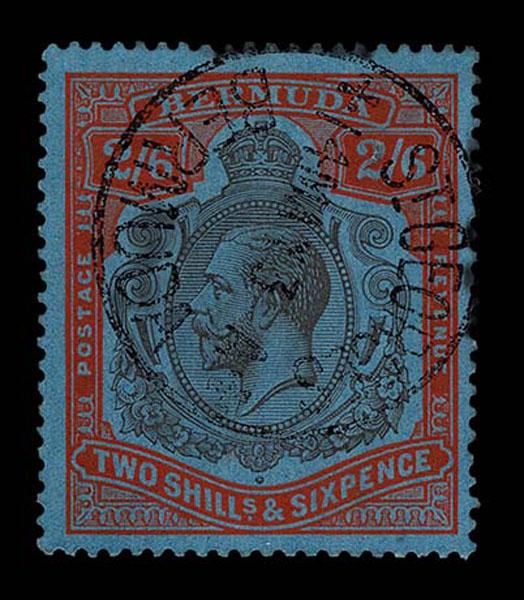 FORGERIES & FANTASIES: Bermuda; 1930 King George V: 2s 5d. black and pale orange vermillion. a lovely distinctive color fiscal cancel and forged cancel applied, very fine. Royal Cert. (2009). (SG 89h 95a $3,250 if genuine)