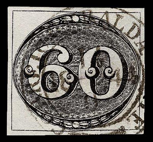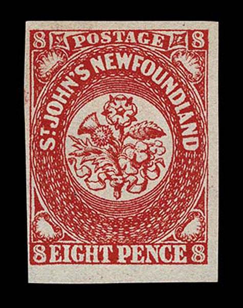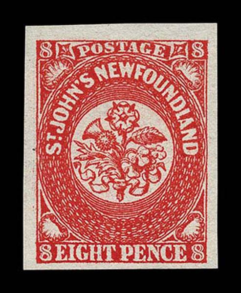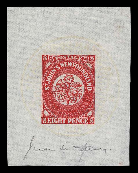 FORGERIES & FANTASIES: Newfoundland 8 Pence Die Proof Type A. a slightly difforent shade than prior lot, but similarly illustrated in Sperati II, very rare, very fine. Ex Walske and probably Sperati's daughter