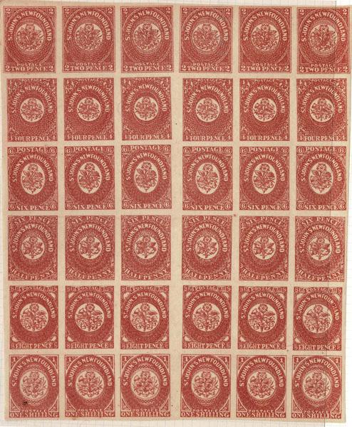 Non-Speratis.FORGERIES & FANTASIES: Newfoundland 1857 4p scarlet vermilion SHEET of 36, full margins all around, full gum, black spot on one. Very impressive. 4 var. $720,000 if genuine Sale and Lot Updates Suggested Bid $150-200 (Image)