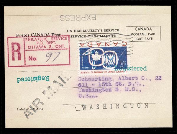 FORGERIES & FANTASIES: Canada, Newfoundland; 1909 Seaway 5c red and blue Inverted . "tied" on Registred Postal label by cancel. Quite becoming. (387a var, $8,000 off cover if genuine) Sale and Lot Updates Suggested Bid $100-150 (Image)