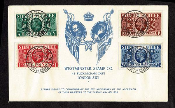 FORGERIES & FANTASIES: GREAT BRITAIN 1935 Silver Jubilee set of four "tied". on May 7 Westminster Stamps Co illustrated envelope. Stamps are genuine. Very dangerous.