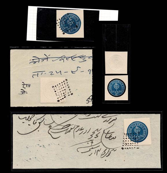 FORGERIES & FANTASIES: INDIA: 7 Scinde Dawks, 3 whites and 4 blues. decent, but not great, Officials 1866 violets 4a and 8a , 1925 one Rupee on 15 and 25 corner copies double overprinted. Very impressive.