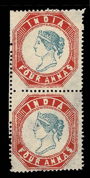 FORGERIES & FANTASIES: India : 1854 4a blue and red Vertical Pair, nice try at printing, o.g. and serrated perforations. (SG 30 var. £130,000 if genuine) Sale and Lot Updates Suggested Bid $300-400 (Image)