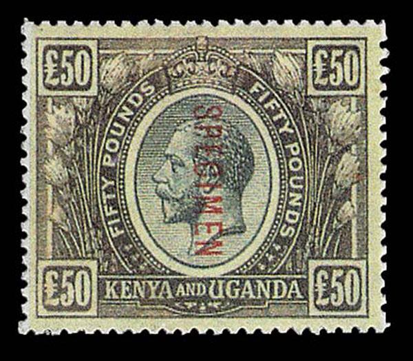FORGERIES & FANTASIES: KENYA & UGANDA.£50, £75, £100 Overprint SPECIMEN. not bad "o,g. or perforations, color a bit soft. (SG 103-105S £14,000 if genuine) Sale and Lot Updates Suggested Bid $300-500 (Image)