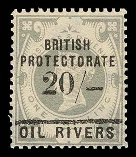 FORGERIES & FANTASIES: Niger Coast Protectorate: 1893 20 sh on 1 sh, black surcharge. no gum, color a bit off. (SG 44 var £16,000 if genuine) Sale and Lot Updates Suggested Bid $150-200 (Image)
