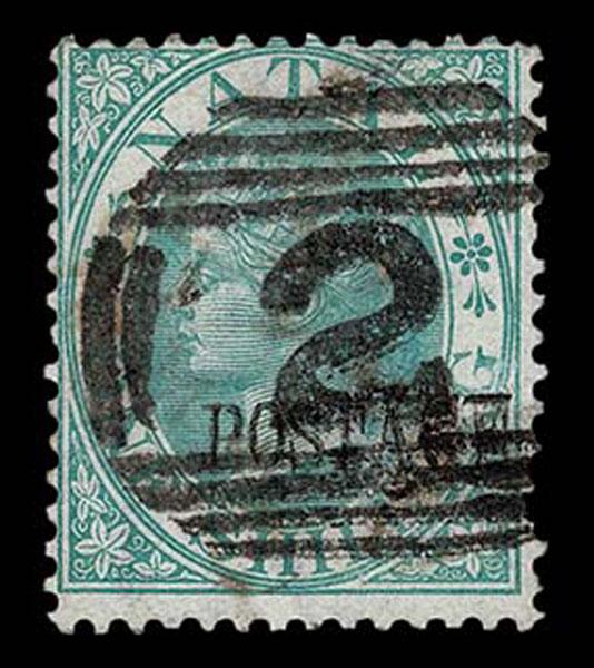 FORGERIES & FANTASIES: Natal; 1870 curved "Postage" overprint in black. on Queen Victoria 1 s green overprint and cancel forged, but very nice job. Brandon Cert (2022). (S,G. 58 £,800 if genuine) Sale and Lot Updates Suggested Bid $100-125 (Image)