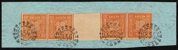 FORGERIES & FANTASIES: German States Bavaria 18K orange gutter strip of four. tied by "356" in cog wheel cancels on piece of envelope Quite attractive. (8a var $26,000 if genuine) Sale and Lot Updates Suggested Bid $100-150 (Image)