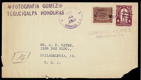 FORGERIES & FANTASIES: Honduras 1925 25c on 20c brown. "tied" by purple bar cancel on envelope (corner damages) to U.S.. Ex BoonshaftFriedl Cert. (1983 as fake). (13 var) Sale and Lot Updates Suggested Bid $75-100 (Image)