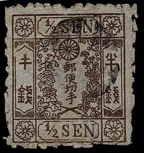 FORGERIES & FANTASIES: Japan: Wada Kotaro Forgery: 1872 Cherry Blossom. 1/2 brown Matsuda printing type III. native wove paper "kihan" error . (9a var $1250 if genuine).