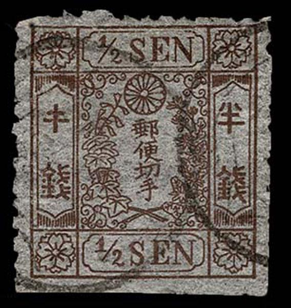 FORGERIES & FANTASIES: Japan: Wada Kotaro Forgery: 1872 Cherry Blossom. 1/2 brown Matsuda printing type III. native wove paper "kihan" error. Excellent quality. (9a var $1250 if genuine).