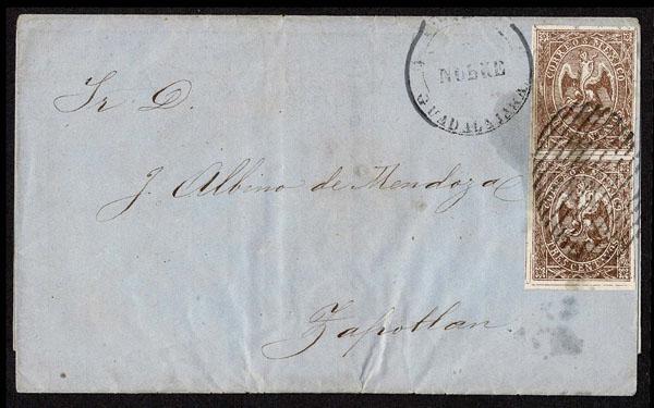 FORGERIES & FANTASIES: Mexico: 1864-66 Eagle. 3c yellow brown, No overprint (remainder) guideline PAIR. full margin "tied by GUADALAHARA c,d,s, and grid cancel, light stain, very creative. (18a var. $1400 if genuine).