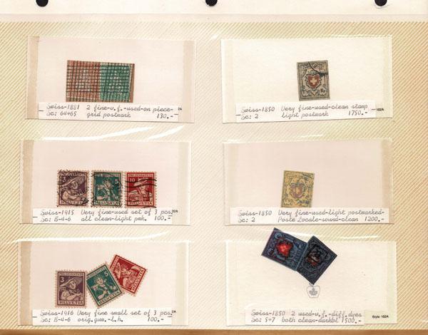 FORGERIES & FANTASIES:SWITZERLAND 192 "stamps" from cantonals to classics, . Semis, etc. colors a bit off but others pretty good, some maybe genuine, also 2 Geneva envelopes. All in dealer priced cards and photo album pages, Nice selection.
