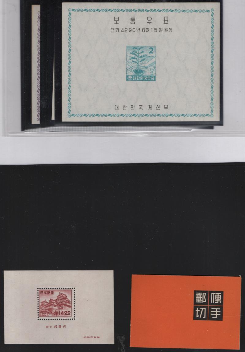 Japan & Korea unused selection (dozens) incl Unused: Japan #427 NH (19), 17a NH, 519, 551 sheet of (4), 580b bklt, Korea 1957 S/S set (KPSC PS153-66 apx $100 ea, one creased), 304a NH (2), 353a-55b NH, 434-43a (stuck down in official folder), 715a-23a; few flts but gen F-VF (Image)