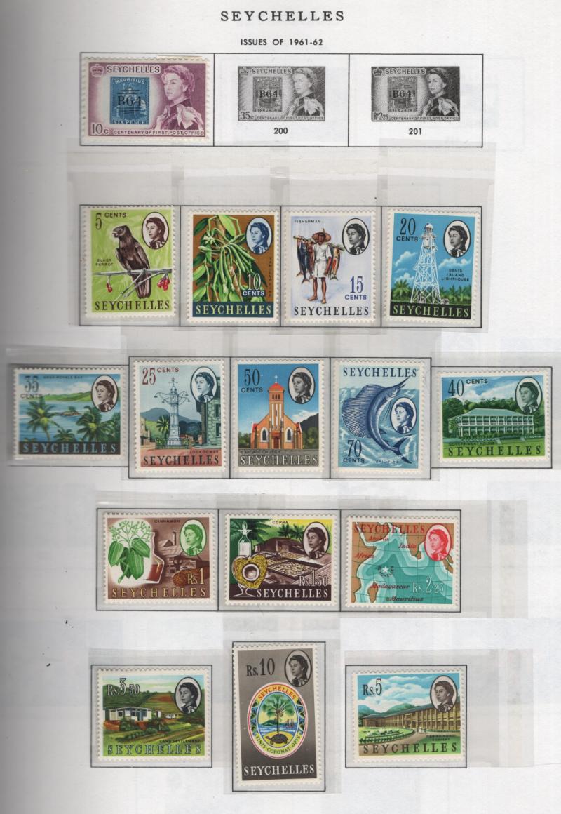 Collection many (100s) */O in (2) Minkus albums incl Unused: Basutoland #61-71, Bechuanaland 169-79 NH, Br Central Africa 23, Mauritius 251-65, N Rhodesia 75-88 NH, Nyasaland 97-111, Rhodesia 25 NH, St Helena 25 NG, 38a, 159-72, Seychelles 198-212, Sierra Leone 195-207 (197 used), S Rhodesia 95-108 NH, SW Africa 314-28, Sudan O23, Zanzibar 214-17, 249-63, Zululand 20; Used: St Helena 5, 13; bonus Comoros & Gabon album (nearly empty); 19th Cent some typical flts, 20th few flts but gen F-VF (Image)
