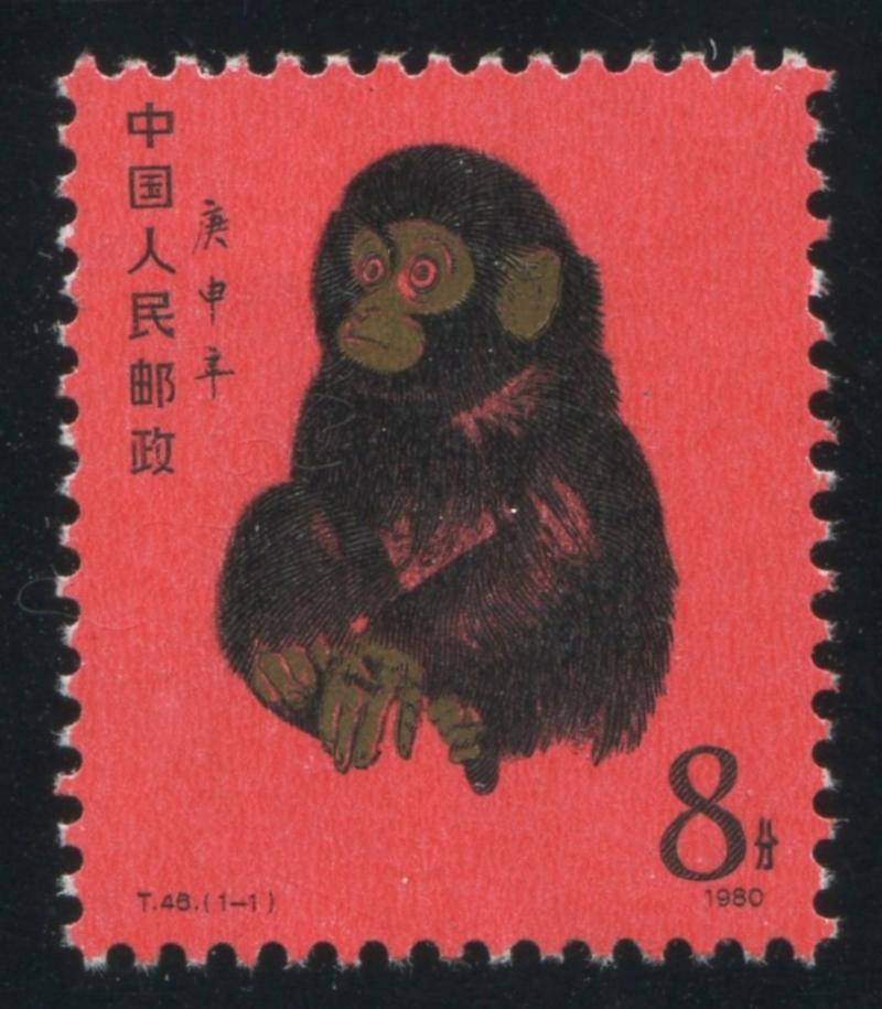 China (People's Republic 1980 #1586, a MNH 8d year of Monkey, has black spot to the gum as usual, Scott value $2150, appears f-vf (Image)