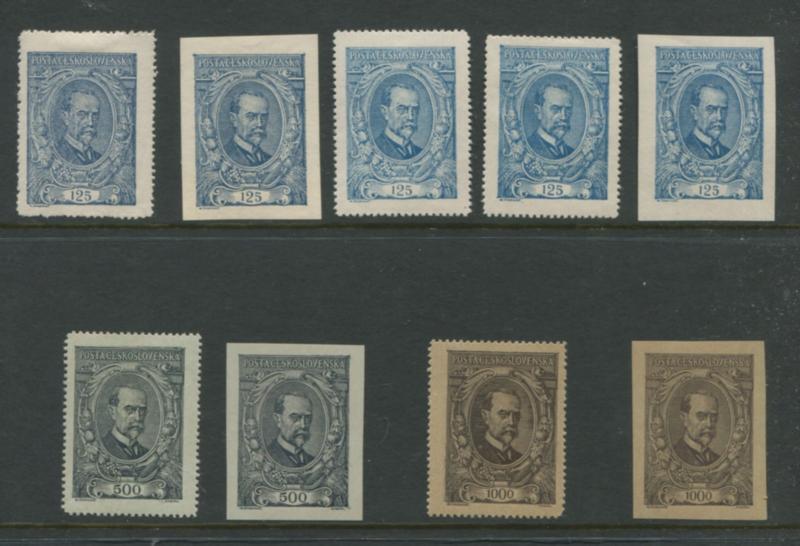 Czechoslovakia 1920, #61 - #63, a group of nine MH, perforated and imperforates, with shades of 125h grey blue, 500h grayish slate and 1000h black brown, Scott value $300.50, all with good margins, appears f-vf (Image)