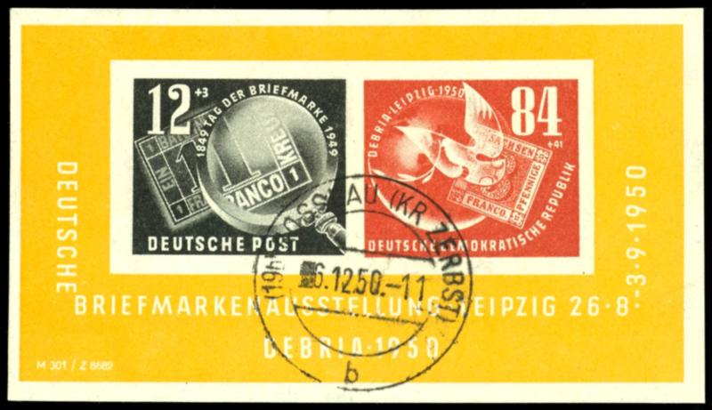 Blockausgabe "Debria" mit seltenem Plattenfehler III "schräger weißer Strich über 1 des Datums 9.3.1950 am rechten Blockrand" (nur in einer Teilauflage vorkommend), einwandfrei postfrisch, Mi. 500.- (Image 1)(Image)