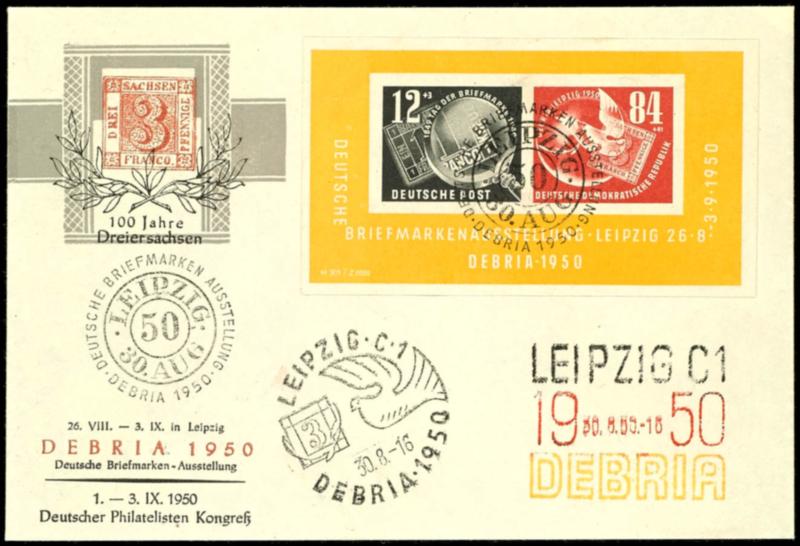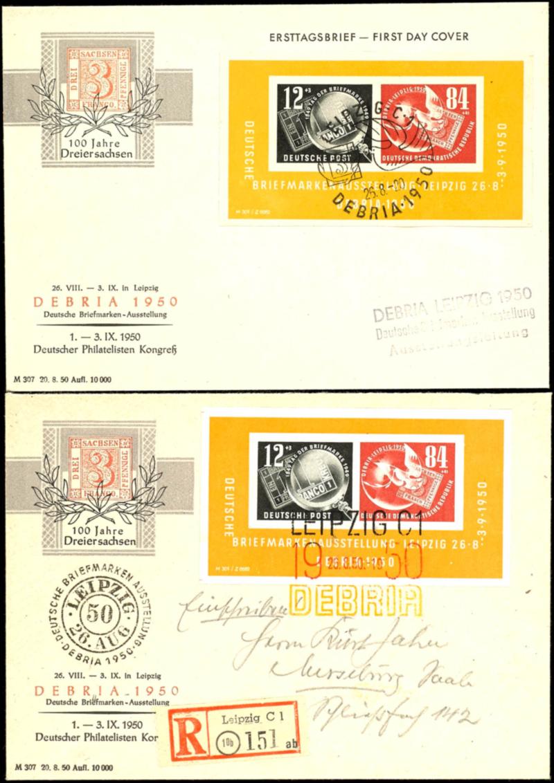 Souvenir sheet issue DEBRIA on two First Day Cover with all 3 special cancellations "LEIPZIG 26.8.50" to Merseburg respectively unmailed, the former with arrival postmark, very fine, one expertized Weigelt BPP, Michel 400.- (Bl.7 FDC)