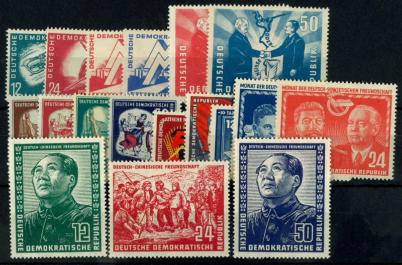 1949-1955, gut geführtes und insgesamt gesehen sauberes Lager in zwei schmalen Steckbüchern. Bei der "DCF" einige ungebrauchte enthalten, sonst quasi nur postfrisch und gestempelt (immer billigste Stpl. gerechnet). Dabei auch Blocks und ein guter Teil Blockeinzelmarken ab "Marx", wertmäßig mehr postfrisch (ca. 60%), Mi. über 11.000.-