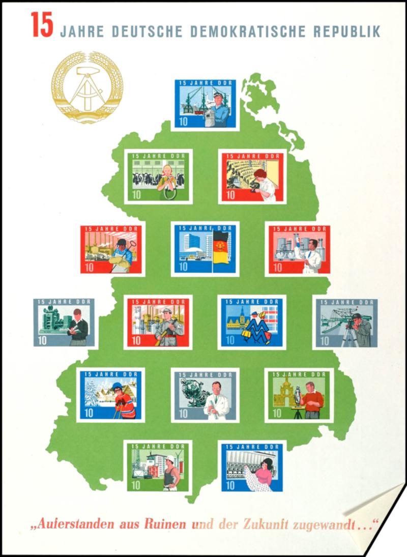 Souvenir sheet issue "15 years German Demokratic Republik (East Germany)", accident in printing: "lower inscription to the right heller becoming printing and sheet cover therefore "dt" from facing on reverse side", photo expertize Siegfried Paul BPP, probably the only one exists! (Bl.19Abart) Certificate