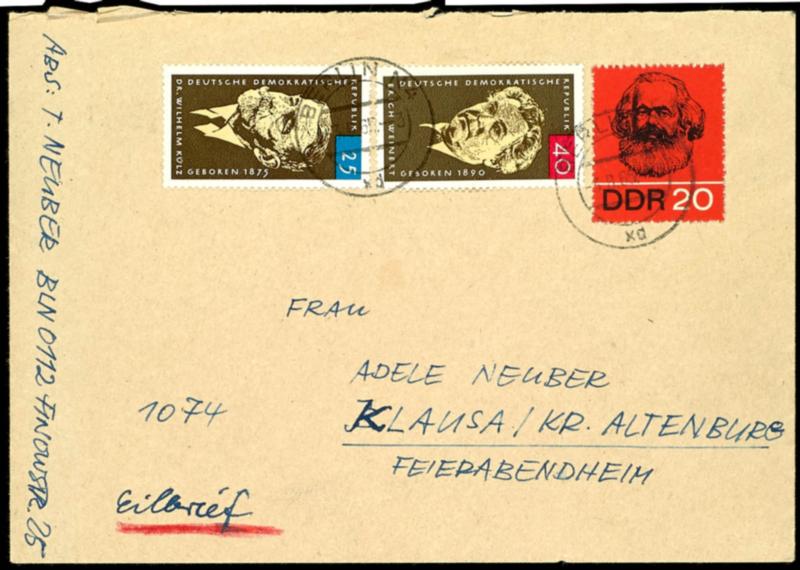1965, Expressbrief von Berlin nach Klausa bei Altenburg, frankiert mit Sondermarken zu 25 Pfennig und 40 Pfennig sowie einem Essay 20 Pfennig Karl Marx schwarz/rot, das Essay ist ein Entwurf von Appelmann für eine nicht verausgabte Karl-Marx-Marke von denen sich noch weitere Exemplare im Postmuseum in Berlin befinden, jedoch kein weiteres Stück auf Brief verwendet bekannt ist, die Herkunft dieser Essays ist nicht geklärt, näheres siehe ausführliches Fotoattest Dr. Peter Tichatzky BPP (Image 1)(Image)