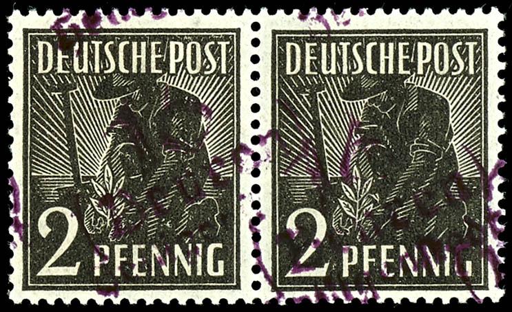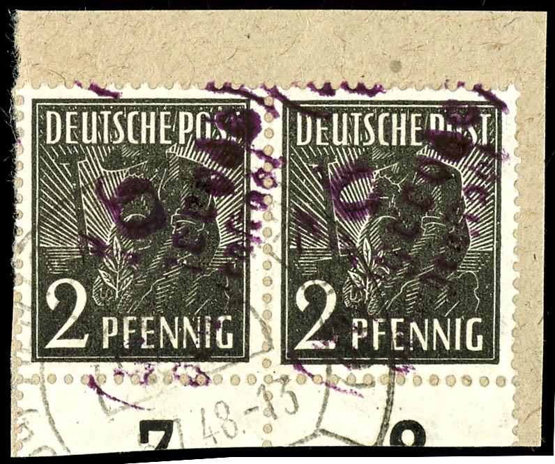 2 pfennigs in the horizontal double piece with purple red overprint 16 (Beuren) Heiligenstadt, mint never hinged, perfect, study group group 7, expertized from Heintze BPP, Michel / study group 120.- (166III) 2 Pfennig im waagerechten Doppelstück mit lilarotem Aufdruck 16 (Beuren) Heiligenstadt, postfrisch, einwandfrei, Arge Gruppe 7, geprüft v. Heintze BPP, Mi./Arge 120.- (Image)