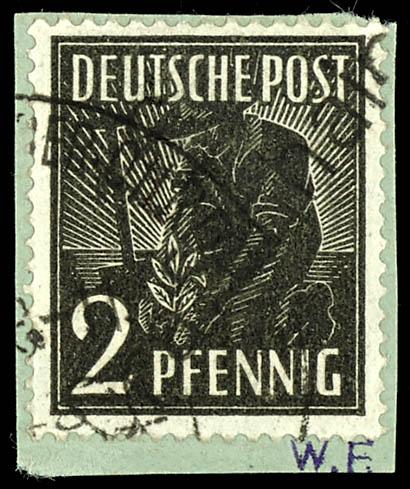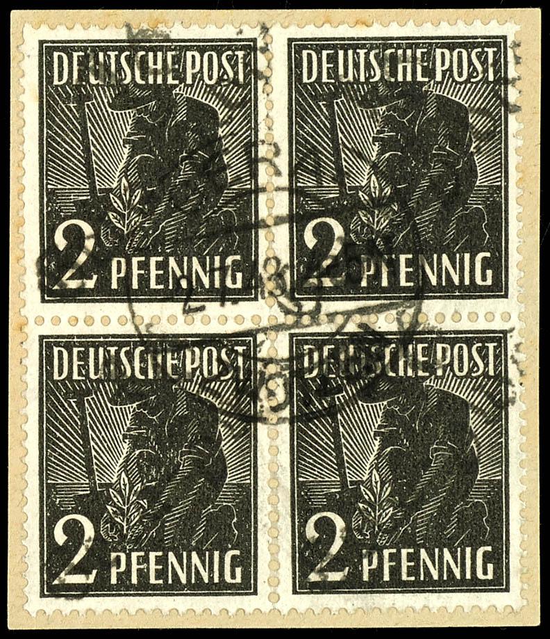 2 pfennigs in the block of four with worked in a jig overprint 16 Gera Zwoetzen, letter piece, perfect, expertized from Heintze BPP, Michel 65.- (166III) 2 Pfennig im Viererblock mit schabloniertem Aufdruck 16 Gera-Zwötzen, Briefstück, einwandfrei, geprüft von Heintze BPP, Mi. 65.- (Image)