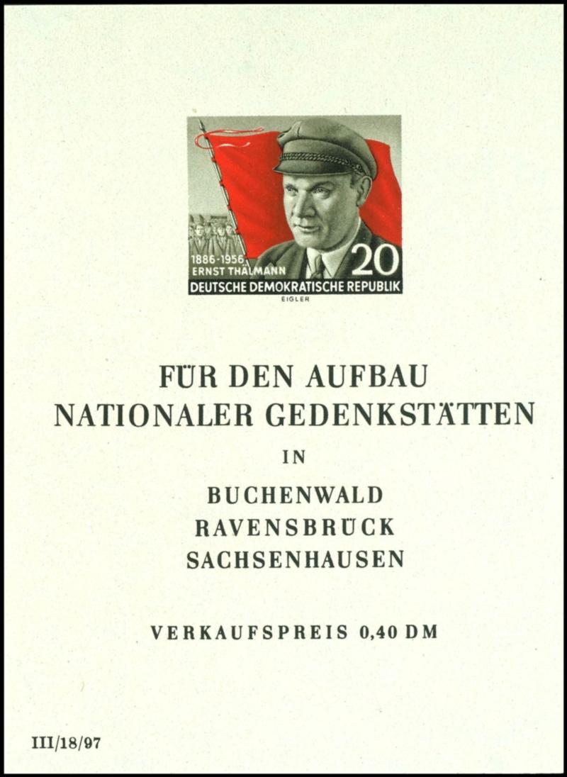 souvenir sheet issue Thaelmann, scarce first issue "with blurred cap seam", mint never hinged with incorrect cut in the wide 73 instead of 74 mm, slight fingerprints, the nice to short time from sale withdrawn first issue is extremely rare, photo expertize George Schoenherr BPP, Michel 3.500.- (Bl.14I) Certificate Blockausgabe Thälmann, seltene Erstauflage "mit verschwommener Mützennaht", postfrisch mit Verschnitt in der Breite 73 anstatt 74 mm, leichte Fingerspuren, die schon nach kurzer Zeit vom Verkauf zurückgezogene Erstauflage ist äußerst selten, Fotoattest Jörg Schönherr BPP, Mi. 3.500.- (Image)