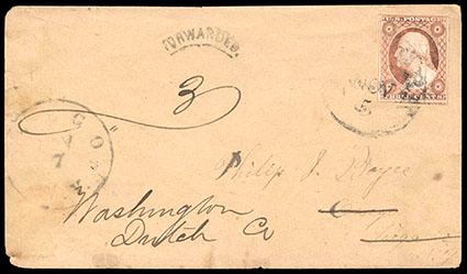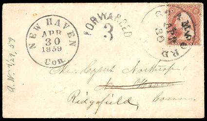 "Forwarded 3" of New Haven. Rimless arc above large "3" on cover with 1857 3¢ tied by "Stamford, Con, Apr 30" cds to New Haven and forwarded to Ridgefield with "New Haven, Con, Apr 30, 1859" cds, F.-V.F. Scott No. 26; Estimate $75 - 100. US$75-100 (Image)