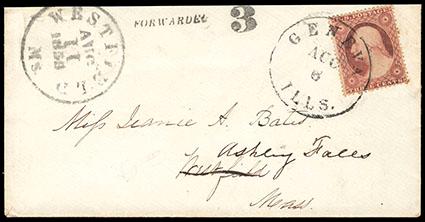 "Forwarded 3" of Westfield, Ms. Small straight line handstamp and rate handstamp on cover forwarded to Ashley Falls, Mass., matching "Westfield, Ms., Aug 11, 1858" forwarding cds, franked with 1857, 3¢ dull red (26) tied by "Geneva, Ills., Aug 6" cds; cover with partial backflap and slightly reduced at top, F.-V.F. Estimate; $150 - 200. US$150-200 (Image)