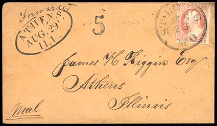 "Athens, Ill. Aug.29". Complete oval with manuscript "Forwarded" around postmark used as a forwarder with matching "5" rate on missent cover to Athens, Ill, franked with 1851 3¢ Dull Red (minor soiling) tied by "St, Louis, Mo, Aug, 23" cds of origin, Very Fine and attractive, this is one of the earliest types of oval postmarks and is pictured in Alexander and Chase's pencil notations on reverse. Scott No. 11; Estimate $150 - 200. US$150-200 (Image)