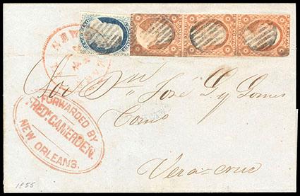 "Forwarded By Fredk. Camerden, New Orleans". Bold and complete red Forwarder's oval on 1853 outer folded cover to Mexico, franked with 1851 1¢ + 3¢ vert strip of 3, 1¢ tied by red New Orleans cds, 3¢ strip with multiple grid cancels, strip stained, F.-V.F. Scott No. 9 + 11A; Estimate $150 - 200.