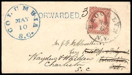 "Forwarded" of Columbia, S.C. Straight line with manuscript "3" rate on cover from Brooklyn, N,Y, franked with 1857 3¢ Dull Red tied by "Brooklyn, NY May 6" cds, then forwarded to Charleston with choice blue "Columbia S,C, May 10" cds, Extremely Fine and attractive. Scott No. 26; Estimate $100 - 200. US$100-200 (Image)
