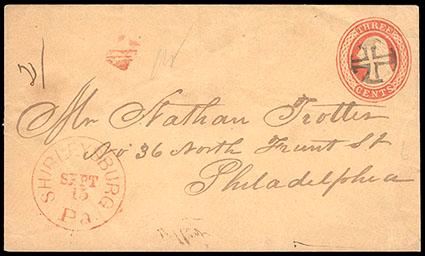 "5 Point Star" of Jersey Shore, Pa. Bold and exceptionally well struck fancy on 1853-55 3¢ Nesbitt entire to Philadelphia, Pa, postmarked "Jersey Shore, Pa Apr 9" cds, Extremely Fine, gem strike and scarce in black as blue is the typical color for Jersey Shore. Scott No. U10; Estimate $75 - 100. US$75-100 (Image)