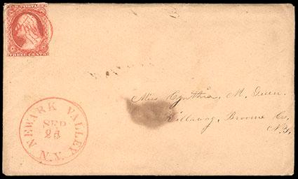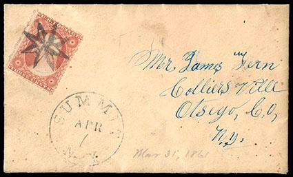 8 Point Shaded Star of Summit, N.Y. Perfect strike of fancy star, barely ties 1857 3¢ Dull Red on small sized cover to Colliersville, NY, postmarked "Summit, NY April 1" (1861) cds, with original enclosure, minor cover toning on reverse, Extremely Fine. Scott No. 26; Estimate $200 - 300.