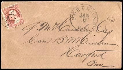 "5 Point Star" of Portland, Con. Well struck fancy elaborate Star cancel (S-E ST-E 13) ties 1857 3¢ type III on cover to Hartford, Ct, postmarked "Portland Conn Jan 9" cds, cover sealed tear at top & all over aging, still Very Fine. Scott No. 26; Estimate $100 - 150. US$100-150 (Image)