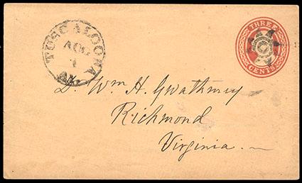 "5 Bar Grid" of Montgomery, Ala. Well struck octagonal cancel (S-E SD-G 104) with bold "Montgomery, Ala Dec 14 1860" cds on 1860 3¢ Star Die entire, flap tear which just extends to top, Very Fine and attractive. Scott No. U9; Estimate $75 - 100. US$75-100 (Image)