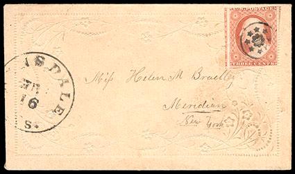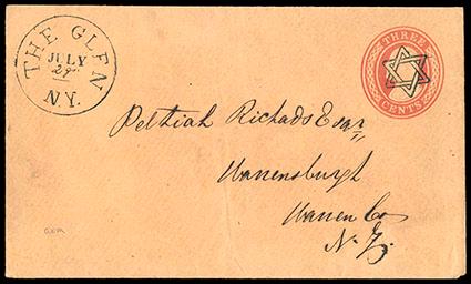 "Star of David" of The Glen, NY. Exceptionally crisp and complete strike with matching cds on 1853-55 3¢ Nesbitt entire to Warrensburgh, N,Y, with perfect strike of "The Glen, N,Y, July 29" cds, Extremely Fine, Gem cover. Scott No. U10; Estimate $150 - 200. US$150-200 (Image)