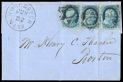"Star of David" of Worcester, Mass. Three strikes of negative Star of David tying three 1851 1¢ Blue, type IV singles on 1854 folded cover to Boston, postmarked "Worcester, Mass, Jun 22" cds at left, middle single with vertical filefold, F.-V.F. and rare, scarce fancy cancel. Scott No. 9; Estimate $200 - 300. US$200-300 (Image)