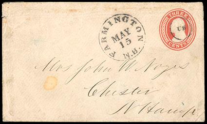 "US" of Farmington, NH. In circle, well struck fancy cancel and cds on 1853-55 3¢ Nesbitt entire to Chester N,H, cover edgewear, F.-V.F. Scott No. U10; Estimate $50 - 75. US$50-75 (Image)