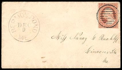 "Grid in Circle" of Hermon Pond, Me. Bold fancy circle with large open 8 bar grid ties 1851 3¢ Dull Red, type 1 on cover to Linconville, Me, postmarked "Hermon Pond, Me Dec 9" cds, Very Fine and attractive, elusive cancel. Scott No. 11; Estimate $100 - 150. US$100-150 (Image)